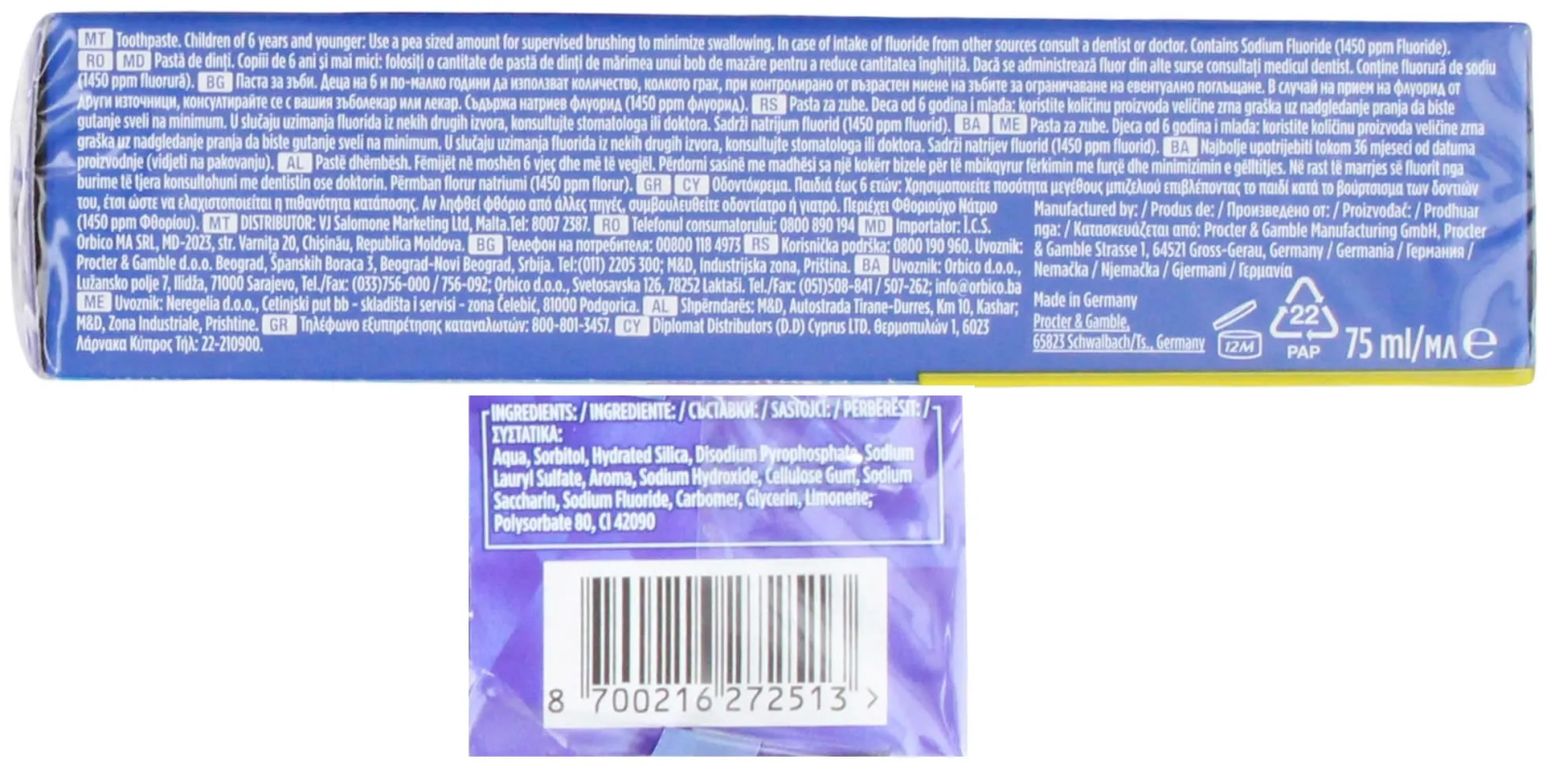 Include tehnologia de albire Oral-B. Spuma patrunde in profunzime si inlatura activ petele de suprafata din zonele greu accesibile, iar fluorul hranitor intareste smaltul. Protejeaza activ impotriva petelor de suprafata 24 de ore, prin periaj de doua ori pe zi.